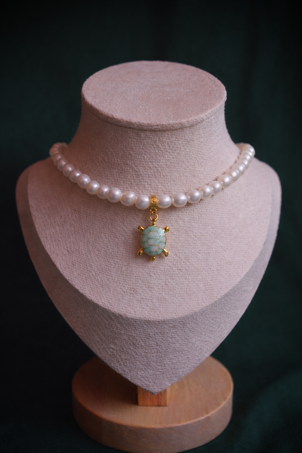 Freshwater pearls accompanied by delicate jade-green drops and a golden turtle at the center.