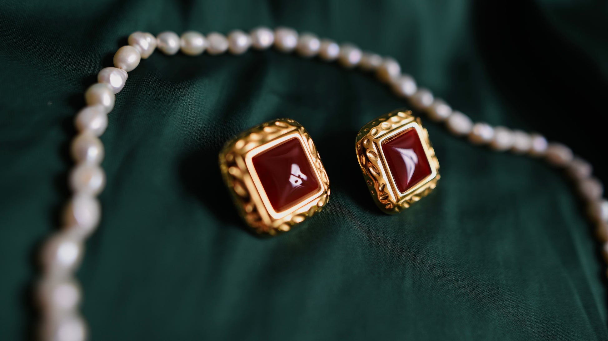 Diese Ohrringe aus goldfarbenem Edelstahl mit tiefrotem Stein verbinden klassische Anmutung mit moderner Beständigkeit. Die klare Form und der warme Farbton verleihen ihnen eine zeitlose, souveräne Ausstrahlung.