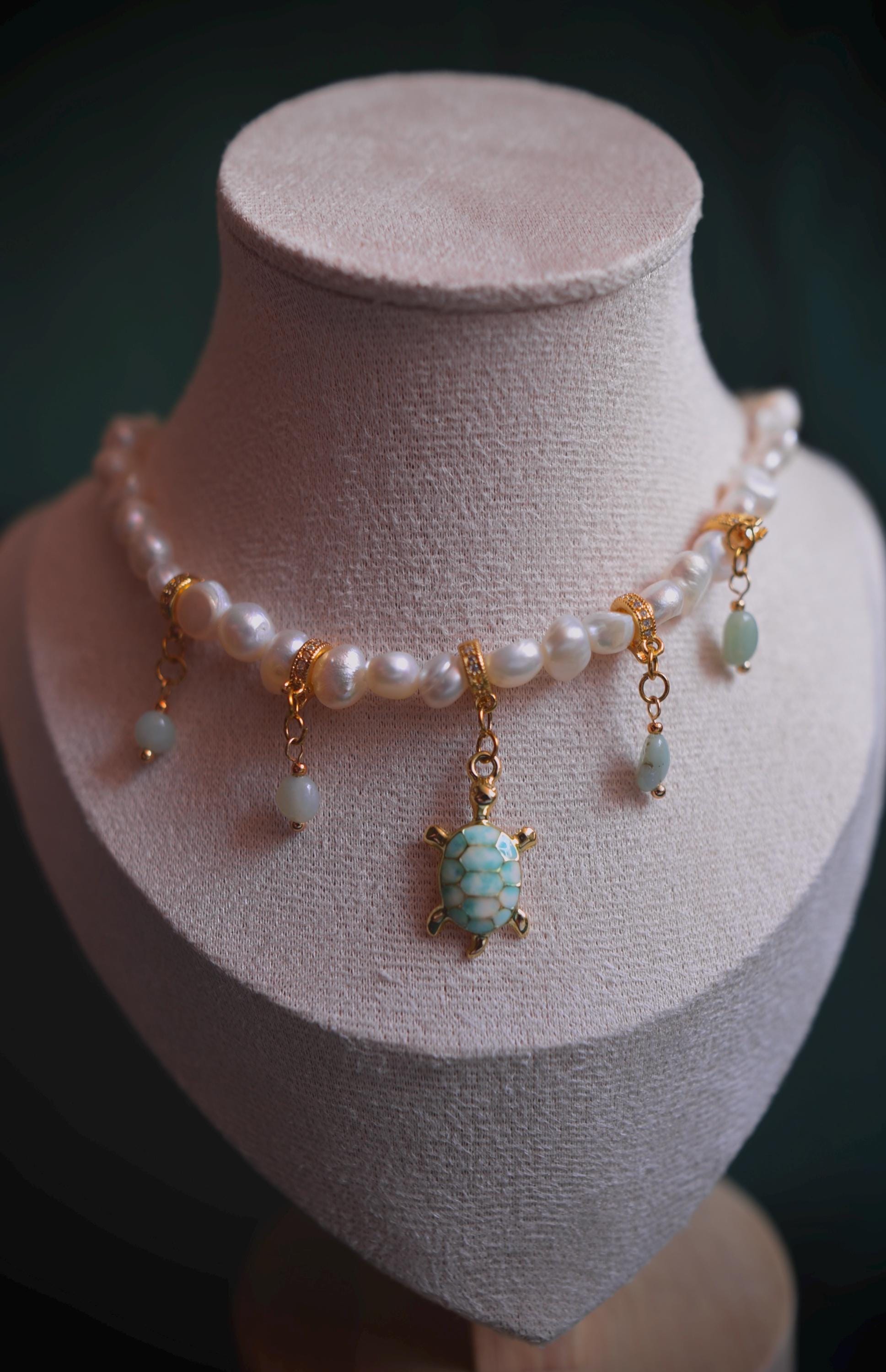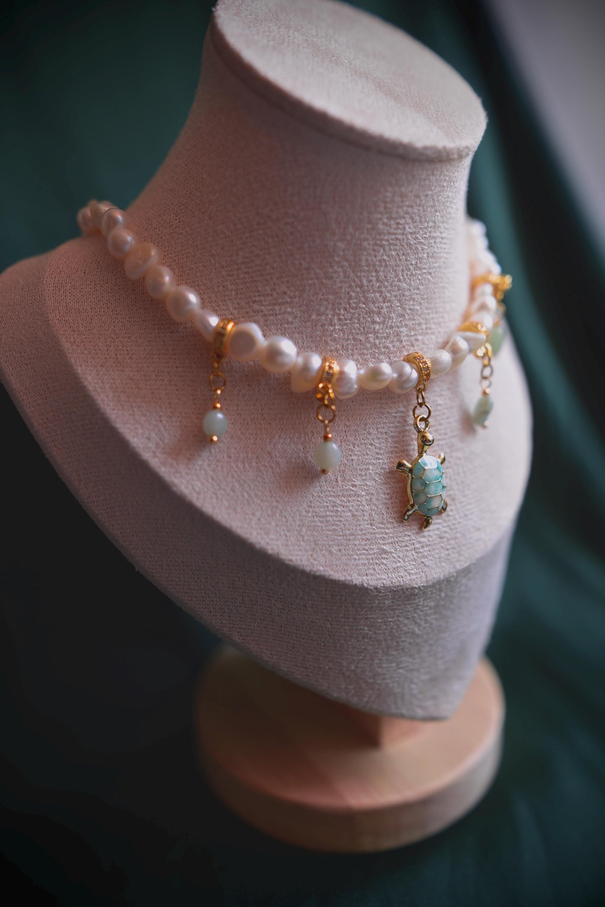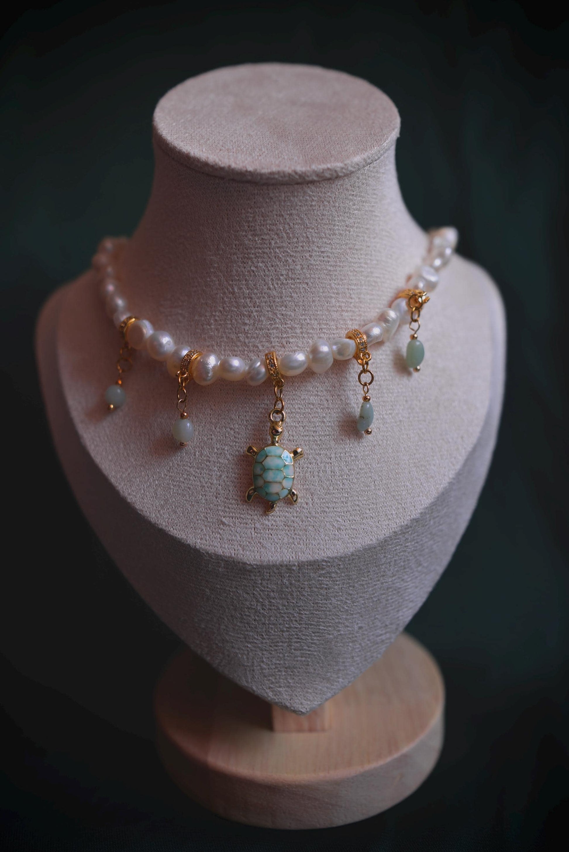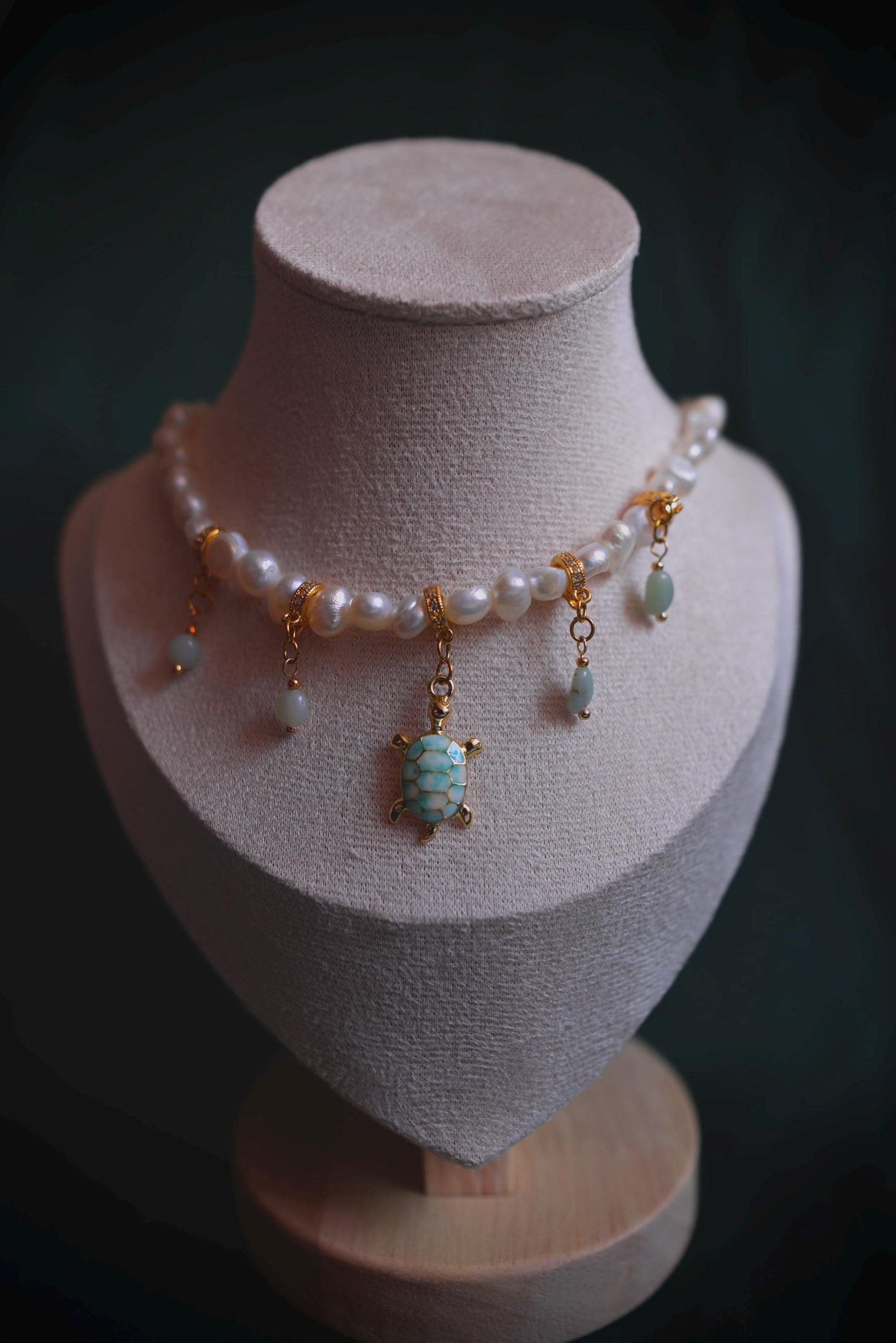 Süßwasserperlen, begleitet von zart jadegrünen Tropfen und einer goldenen Schildkröte im Zentrum.