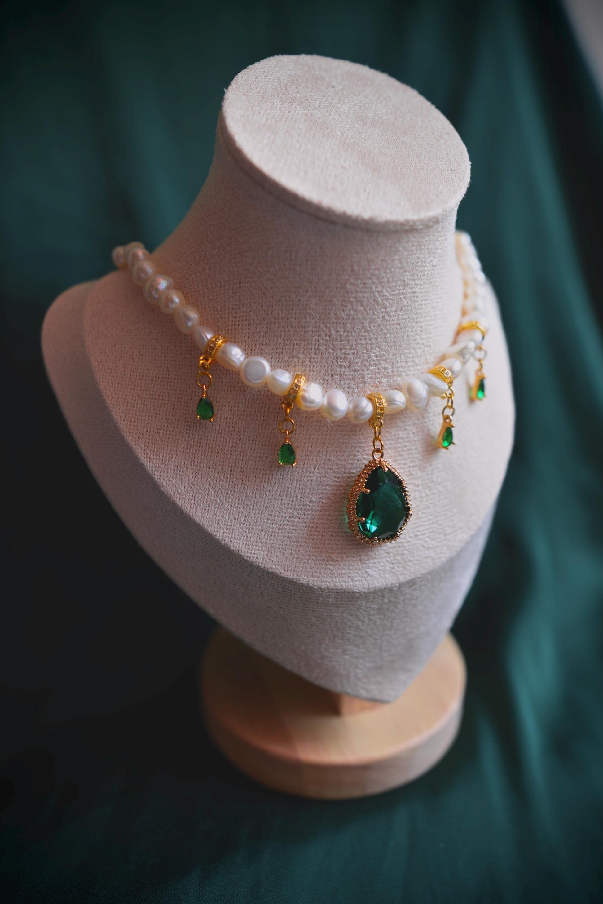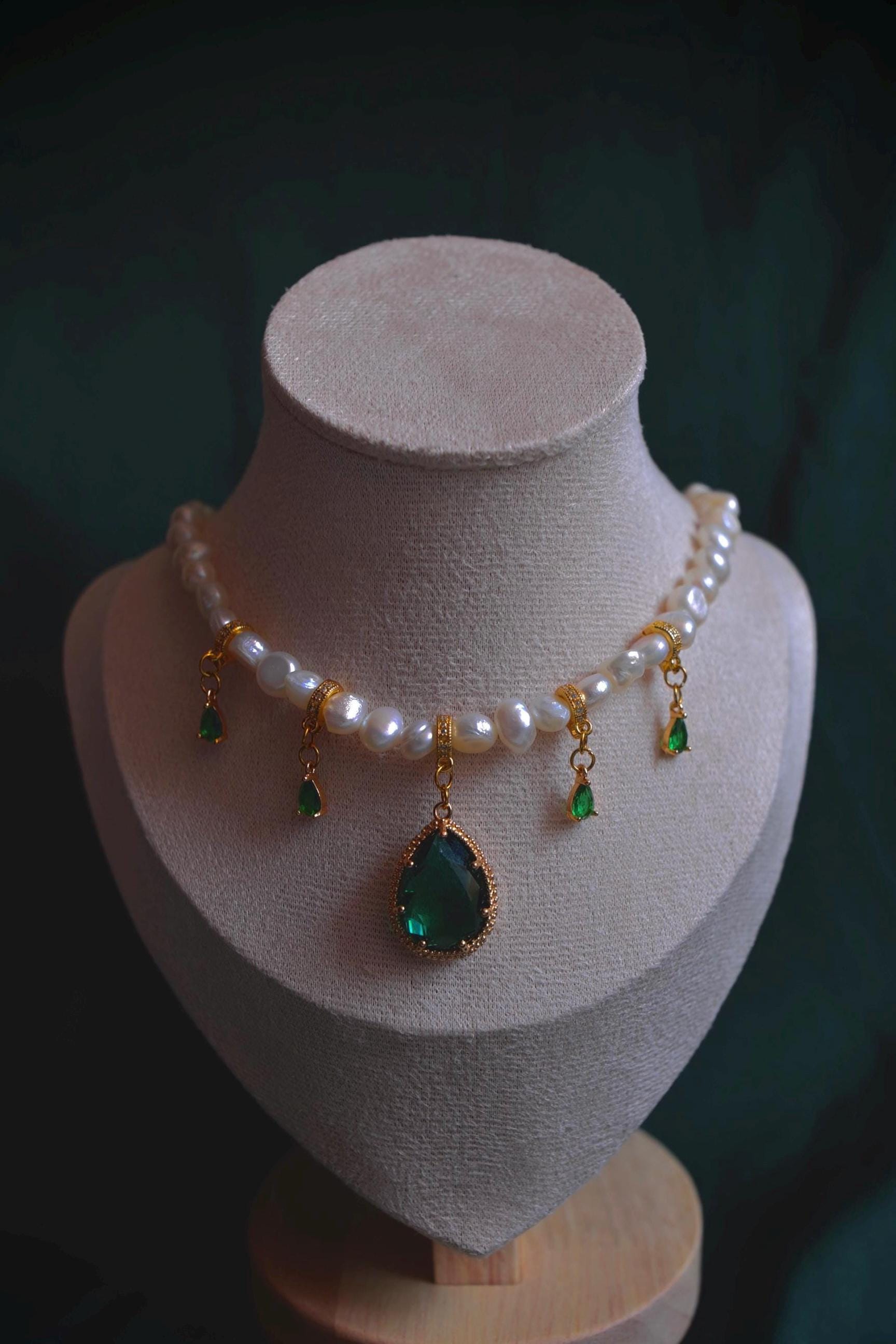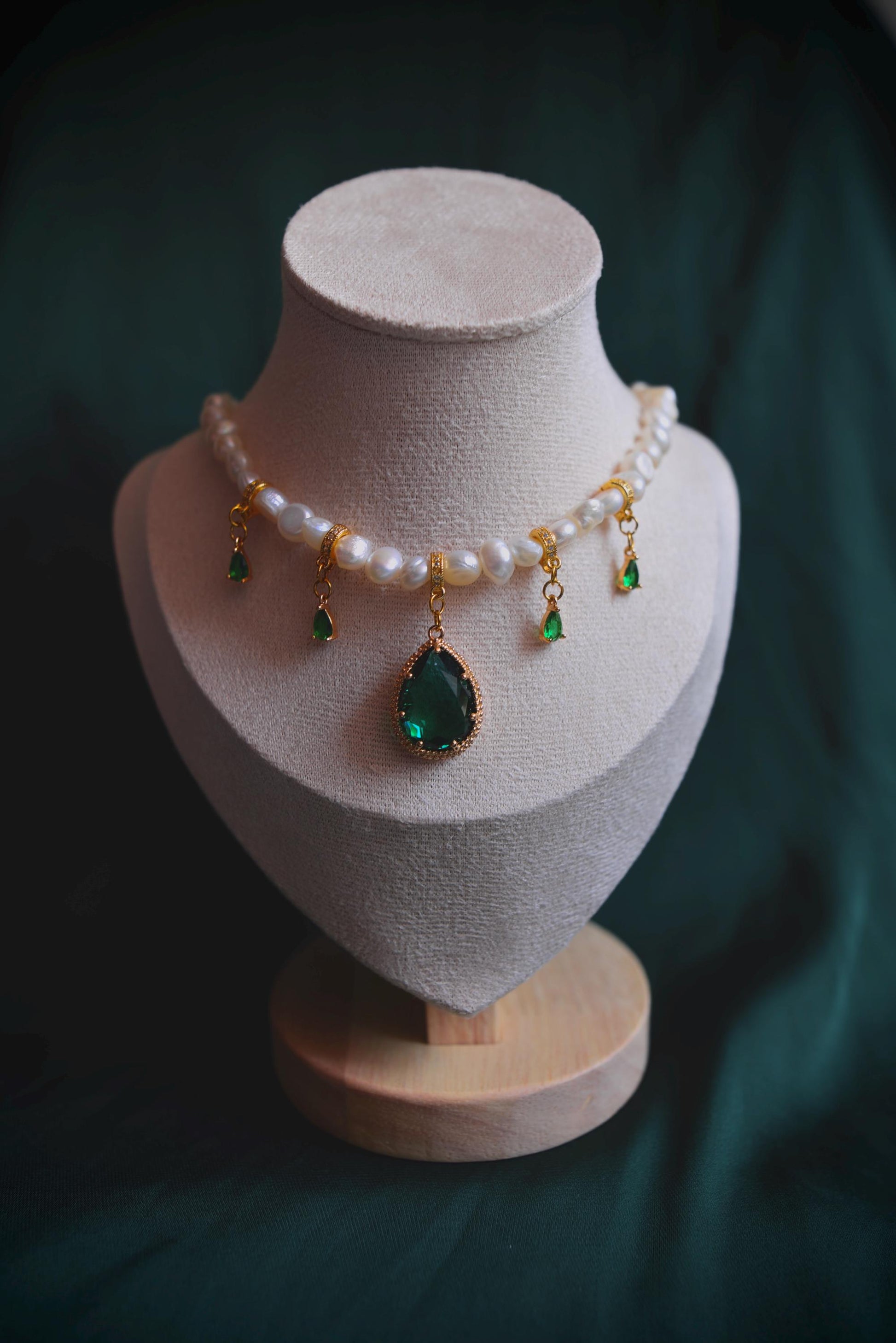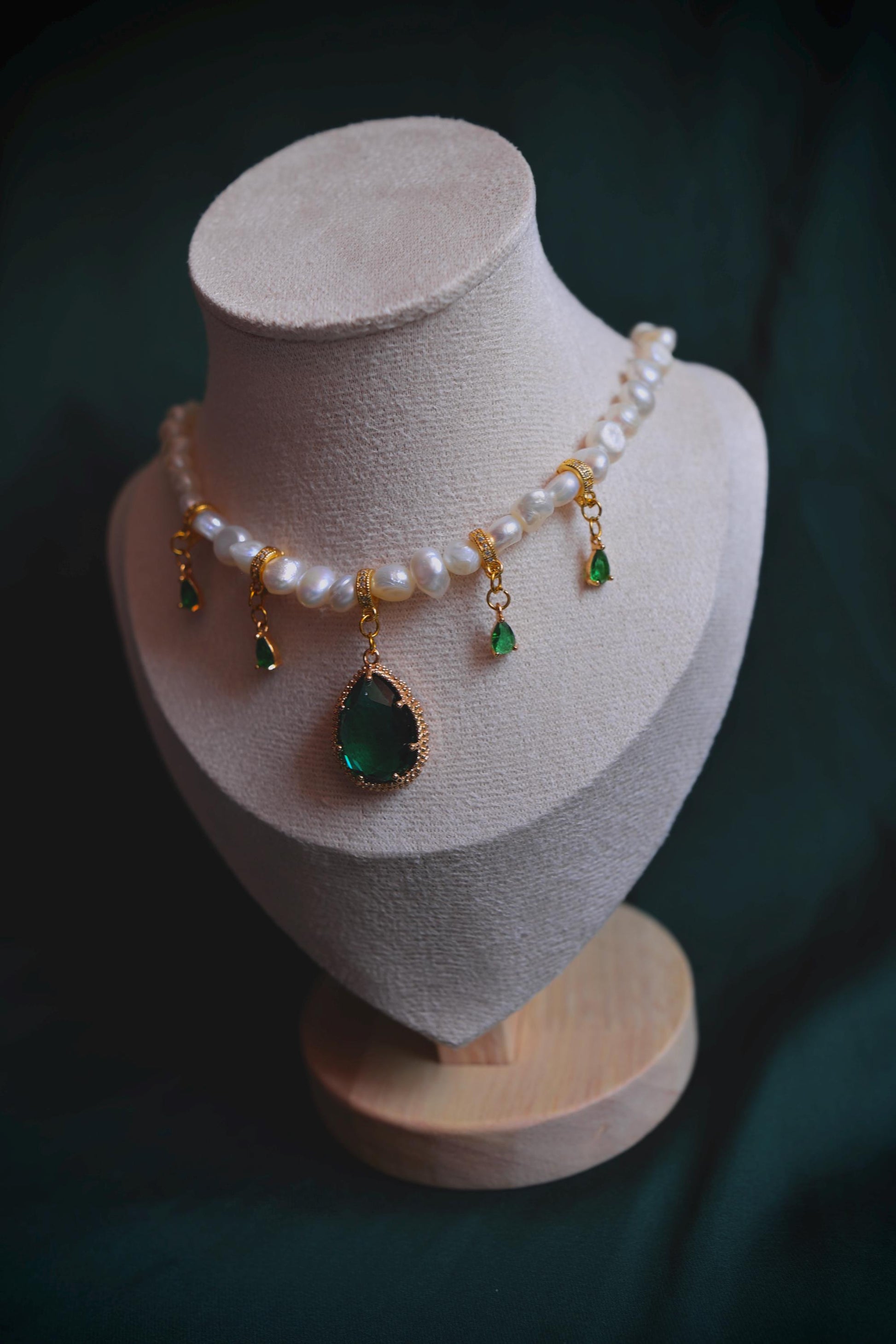 Süßwasserperlen, gehalten von tiefem Smaragdgrün – einer Farbe, die seit Jahrhunderten für Klarheit, Beständigkeit und stille Würde steht.