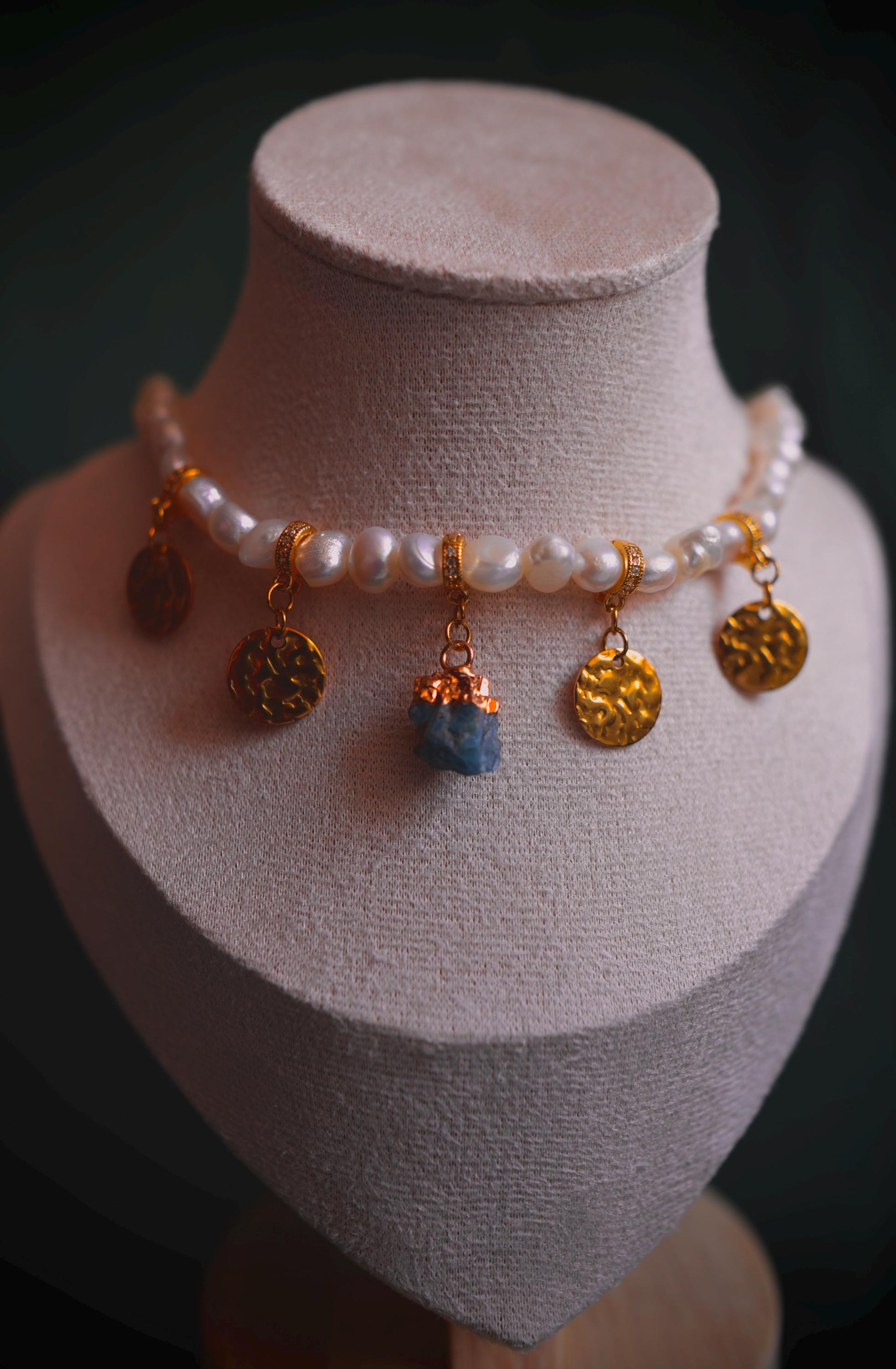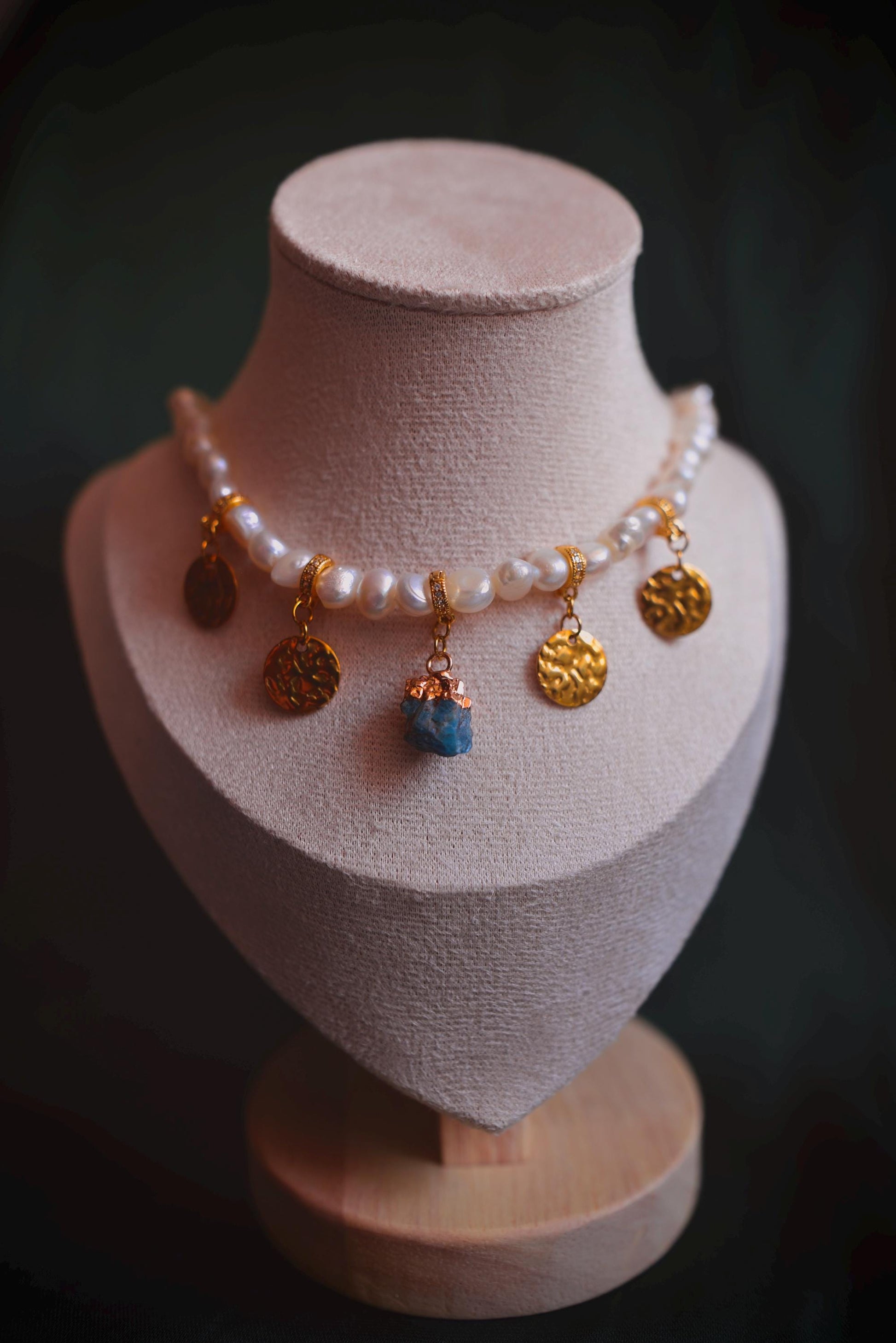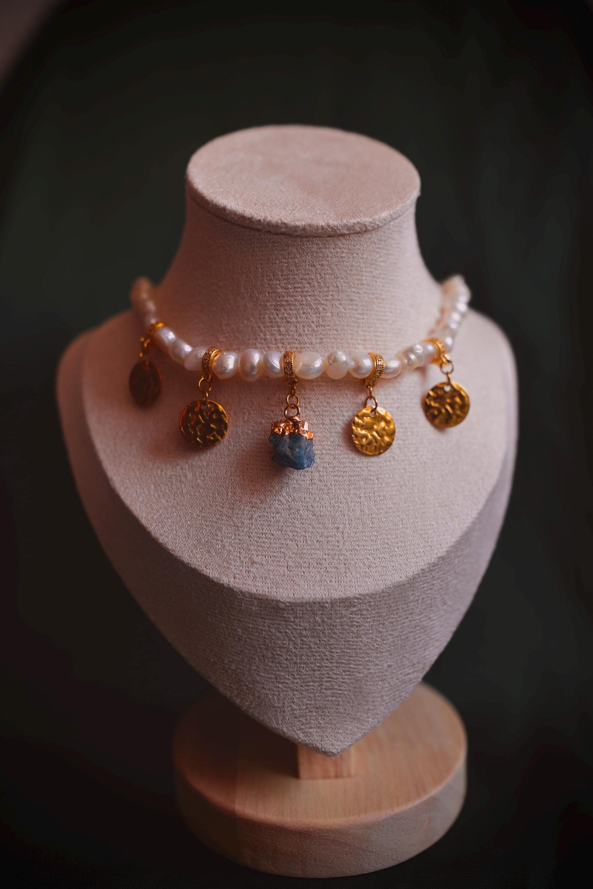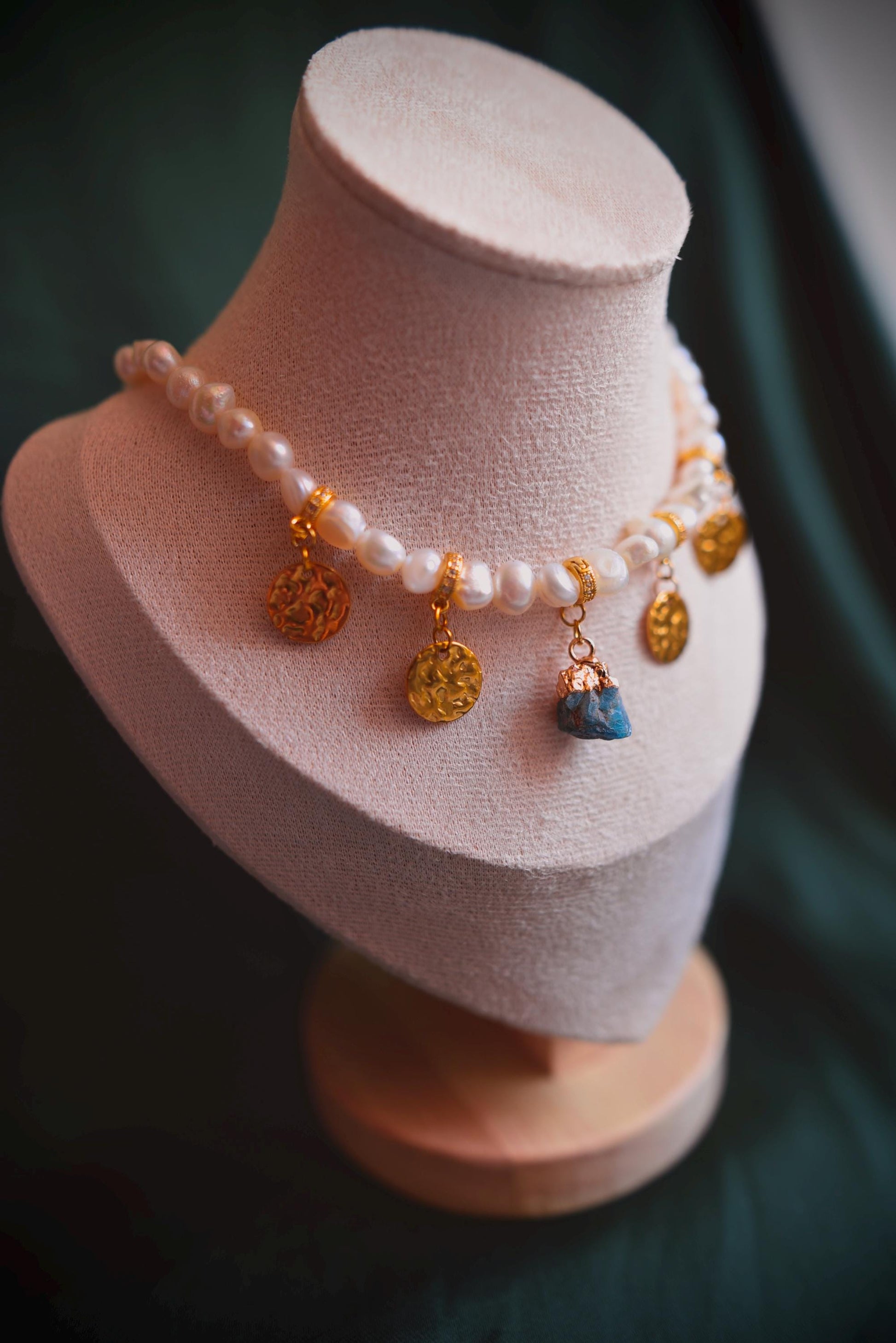Süßwasserperlen, begleitet von natürlichem Aquamarin – dem Stein stiller innerer Stärke.