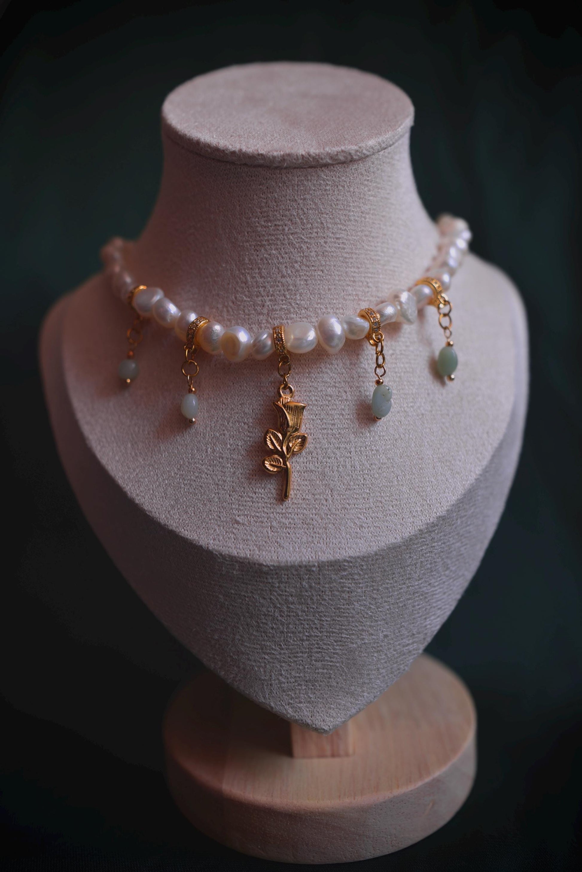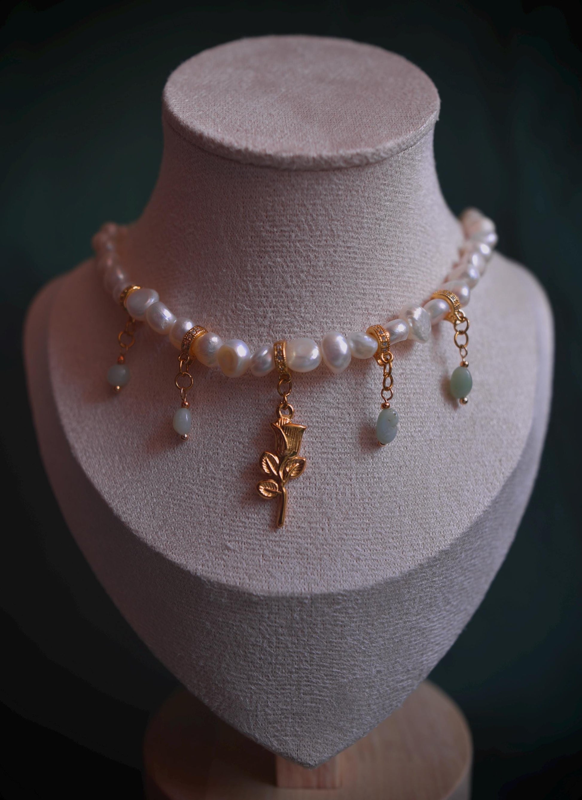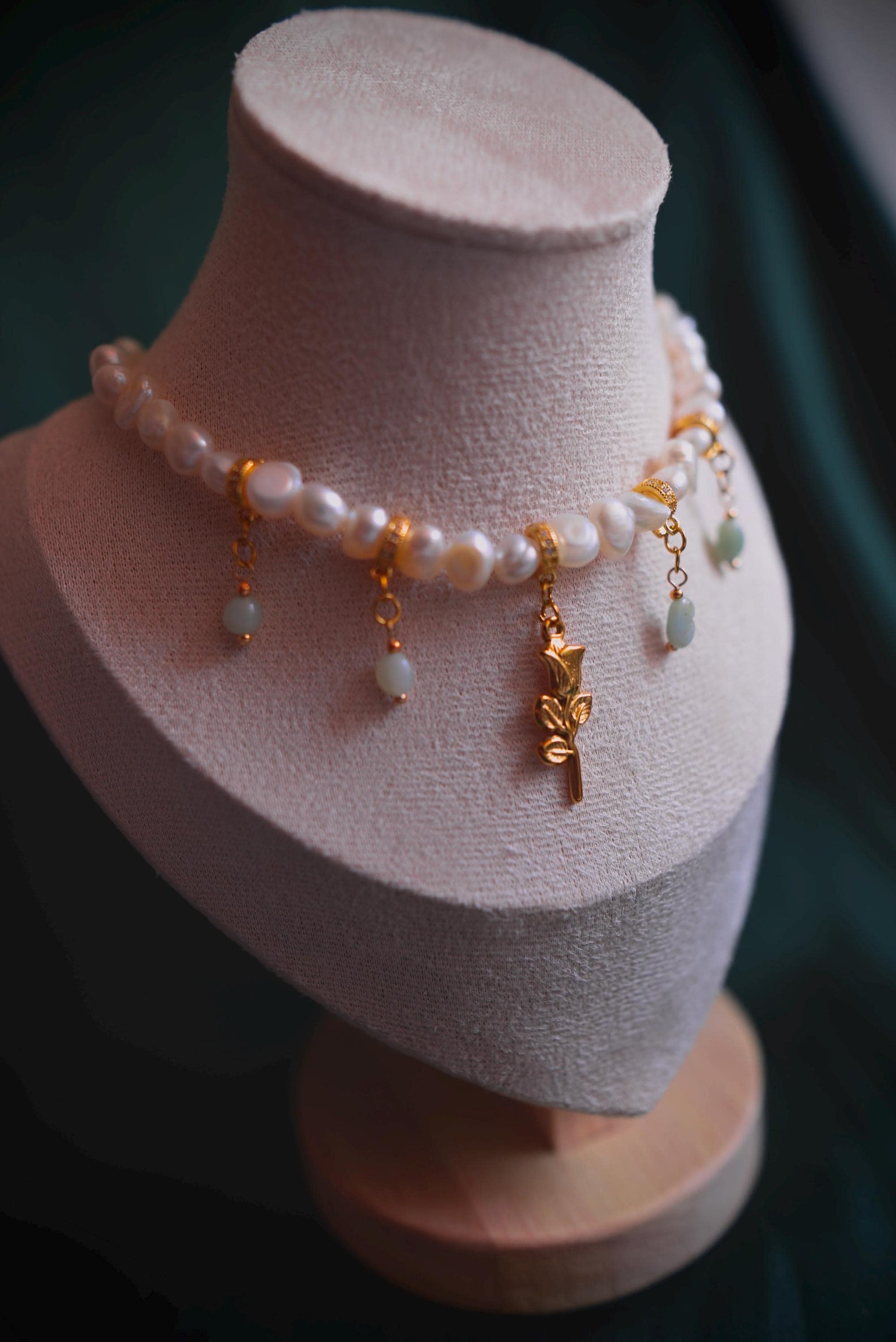 Süßwasserperlen und zarte jadegrüne Tropfen umrahmen eine goldene Rose – ein Zeichen von Wachstum, das seinen eigenen Rhythmus kennt: still, bewusst und unbeirrbar.