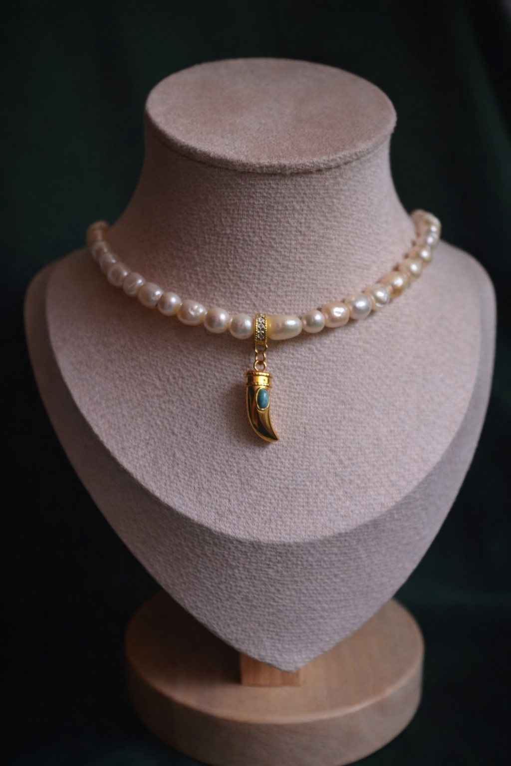 Пресноводный жемчуг — нежный, как память — встречает золотой талисман, созданный для защиты, а не для устрашения.